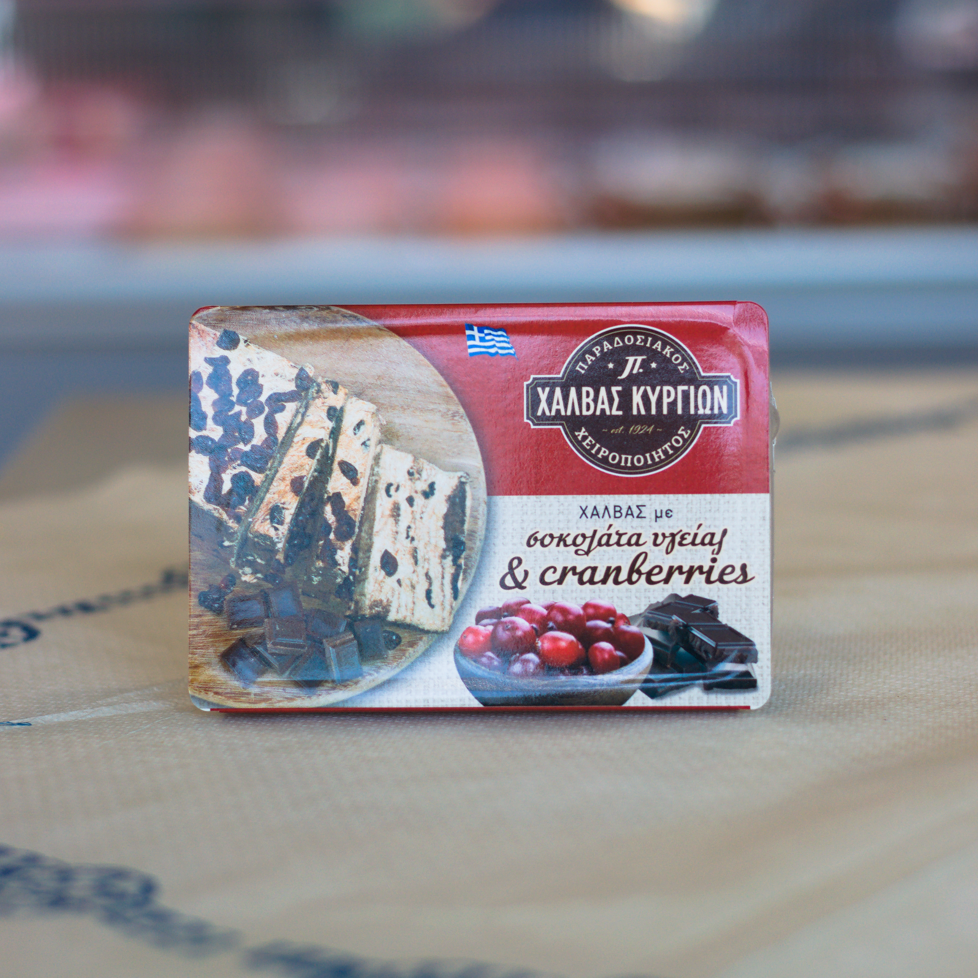 chałwa czekolada żurawina, chałwa Kirgion 250 g, grecka chałwa z żurawiną, chałwa z gorzką czekoladą 70%, chałwa sezamowa tahini, słodycze greckie chałwa, deser do kawy, chałwa do jogurtu, chałwa na prezent, halva czekoladowa z owocami