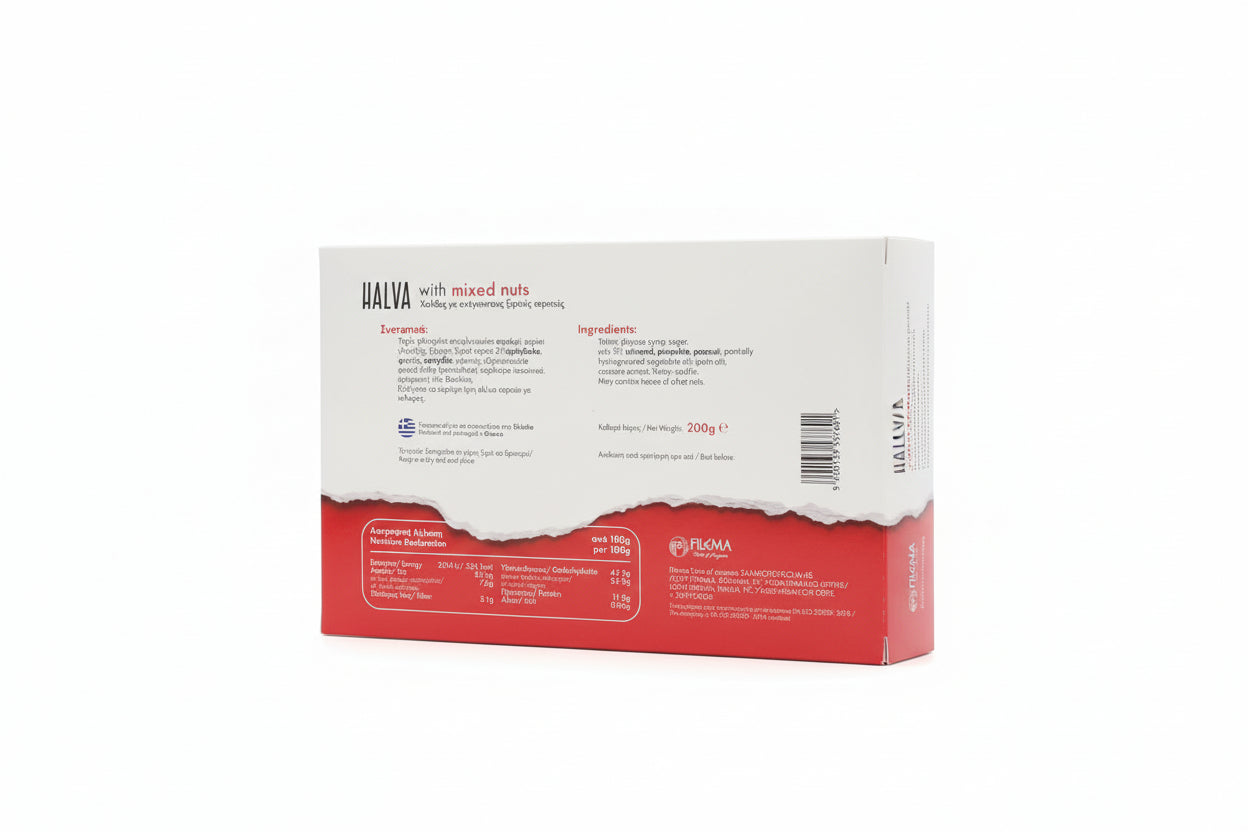 chałwa mix orzechów, chałwa Filema 200 g, grecka chałwa sezamowa, chałwa tahini z orzechami, chałwa do kawy, chałwa na deser, chałwa do jogurtu, słodycze greckie chałwa, chałwa z Krety, chałwa Heraklion, chałwa na prezent, chałwa z tahini