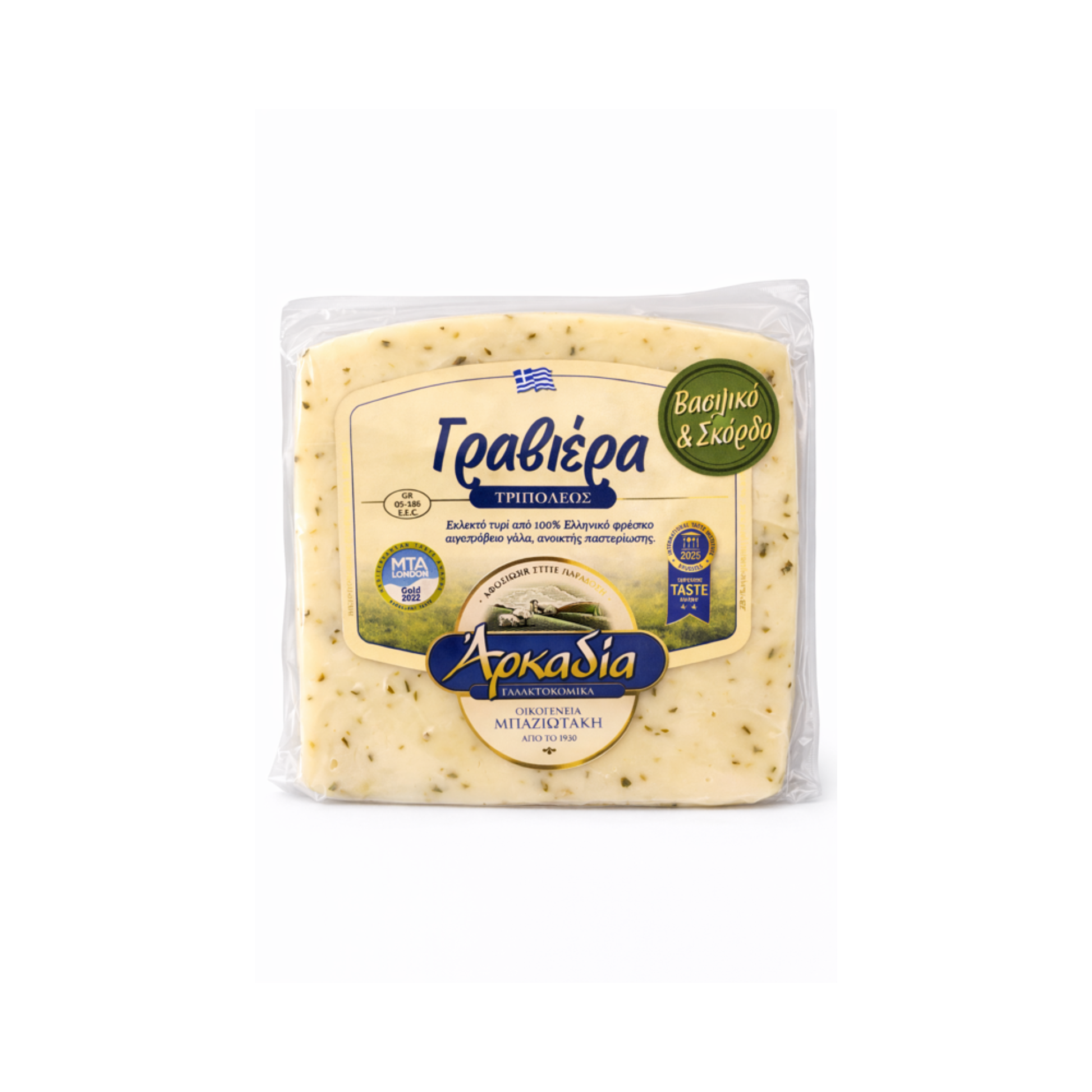 Graviera to grecki ser dojrzewający o zwartej, twardszej strukturze. Zwykle ma lekko maślany, orzechowy charakter i dobrze się topi, dlatego sprawdza się zarówno na zimno, jak i na ciepło. Ta wersja jest doprawiona czosnkiem i bazylią, dzięki czemu świetnie wypada w prostych daniach bez wielu przypraw.