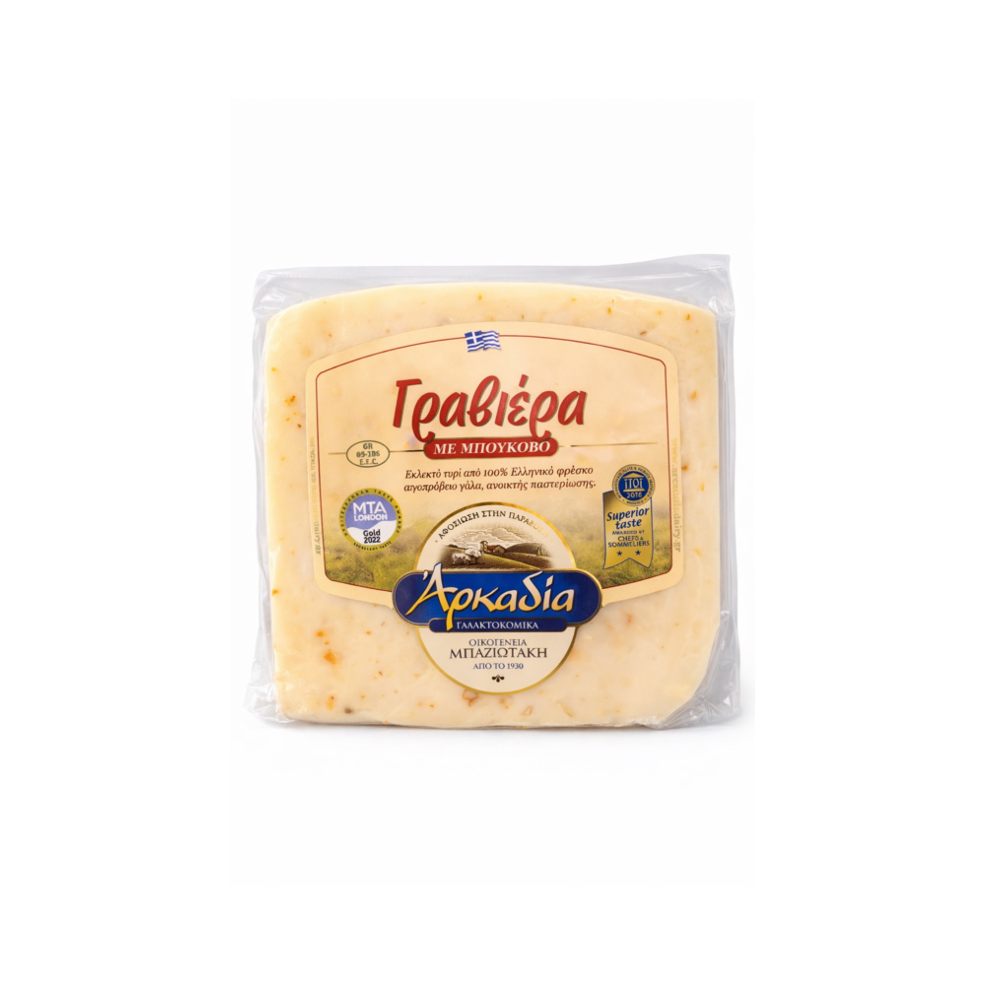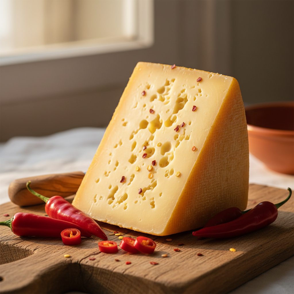Zwarto-dojrzewający ser o sprężystej strukturze, który dobrze się kroi i świetnie się ściera. W smaku: klasyczny „serowy” charakter Graviera z pikantnym akcentem chili — od delikatnego rozgrzania po wyraźniejszą ostrość (zależy od partii).